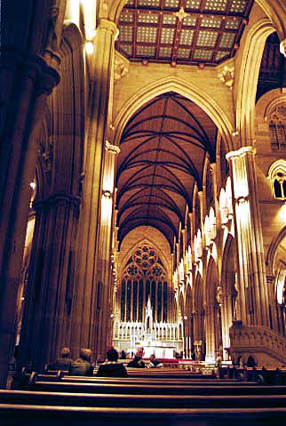 セント・メリーズ大聖堂の内部。世界でも指折りのゴシック建築に包まれた教会内部は、入り口から祭壇まで100mにも及び、祭壇背後のステンドグラス38枚が荘厳な雰囲気を醸し出していた。