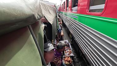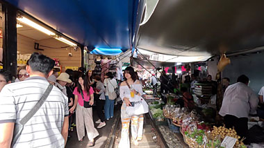 世にも珍しいメークロン市場の電車の朝一到着風景を見る為にホテルは7時出発であった。既に多くの観光客でごった返していた。線路に並べられた野菜や果物、更に雑貨など色取り取り。電車が近づくとそれまで並べていた商品や覆い被さったテントを収納し、カメラを手にした観光者達が一斉にその様子を写そうと線路の周りに群がる。それを写そうと私もその中に紛れ込んだ。何と電車が20mまで近づくまで危険を承知で写真を撮る人々。危険きわまりない行動だ。店の人は夫々収納したテントを電車に接触させない程度(凡そ10センチ程)に離して。電車は警笛をならしながら時速20kmで近づいてくる。異様な光景だった。この様子をSNSに乗せたいのか?そう云う私も同類か??