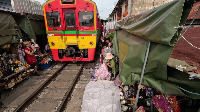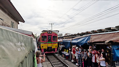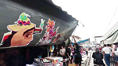 メークロン市場、電車が通る度に世にも珍しい市場の光景が有名となった |