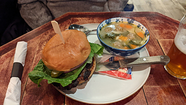 | 本日、日中の気温高め(自撮りでパチリ) | 一昨日行ったThe Black Night Pubの バイソンハンバーグと野菜スープセット |